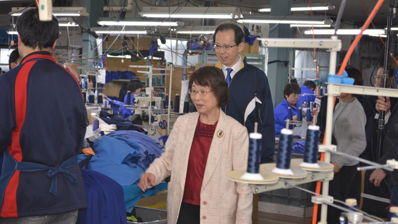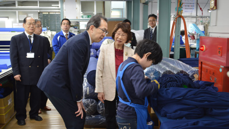 知事は懇談の中で製造されたユニフォームを試着し、「着心地が良く、会社の温かさが伝わってきました。工場の中では女性陣が頑張っており、障がいを持っておられる方が一生懸命に自分の仕事を「までいに」やっている姿を見て、胸が熱くなりました。県でも障がい者雇用の先進的な取組のお手本として、学ばせていただきたいと思います。」と話しました。<福島県公式サイトより一部引用>